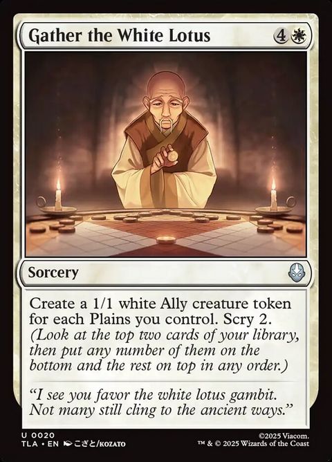 Create a 1/1 white Ally creature token for each Plains you control. Scry 2. (Look at the top two cards of your library, then put any number of them on the bottom and the rest on top in any order.)