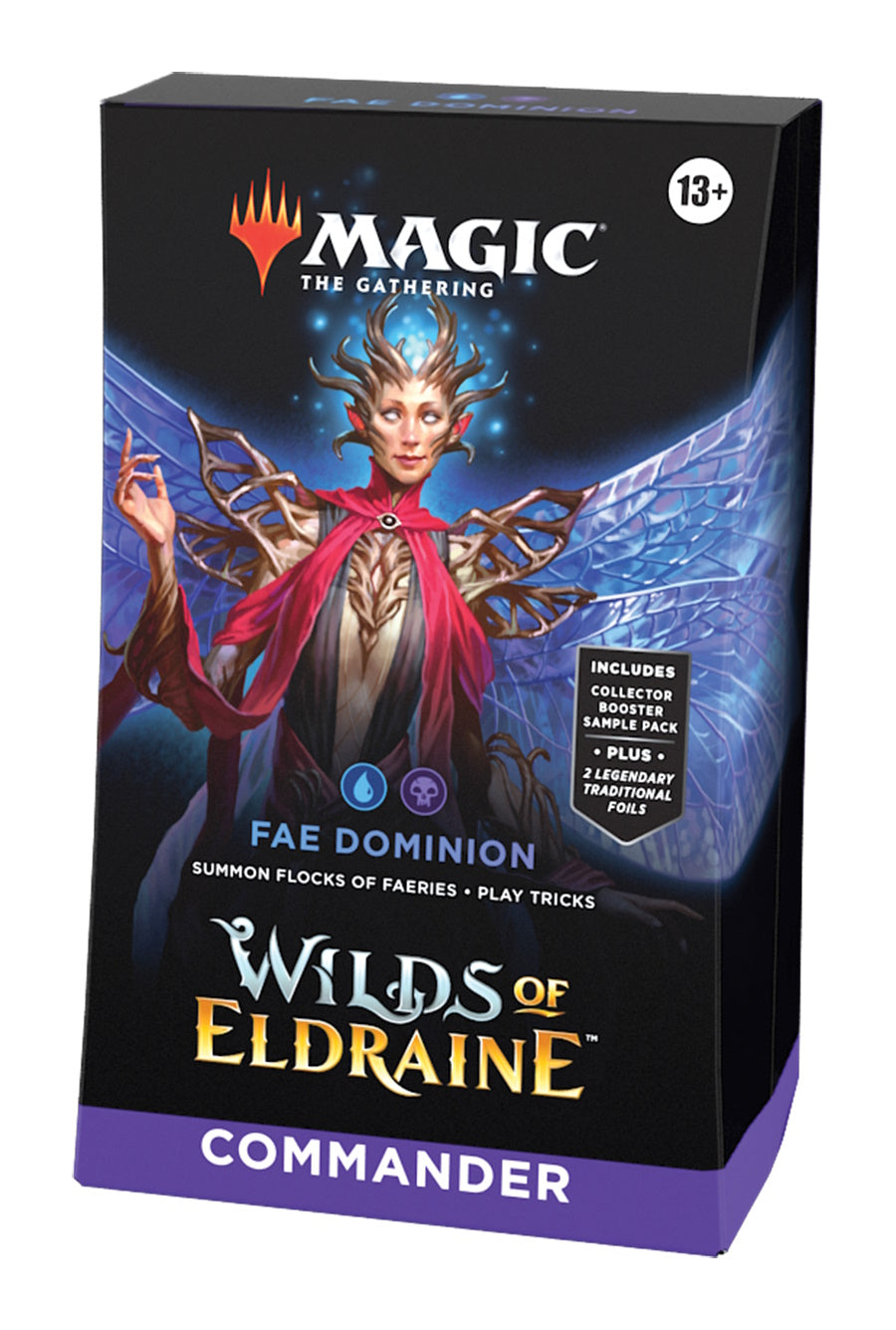 The Wilds of Eldraine Fae Dominion Commander Deck includes 1 ready-to-play Blue-Black deck of 100 Magic cards (2 Traditional Foil Legendary Creature cards, 98 nonfoil cards), a 2-card Collector Booster Sample Pack (contains 1 Traditional Foil or nonfoil special treatment card of rarity Rare or higher and 1 Traditional Foil Borderless Uncommon card), 1 foil-etched Display Commander (a thick cardstock copy of the commander card with foil etched into the card’s border and art), 10 double-sided tokens, 1 deck box (can hold 100 sleeved cards), 1 Life Wheel, 1 strategy insert, and 1 reference card.